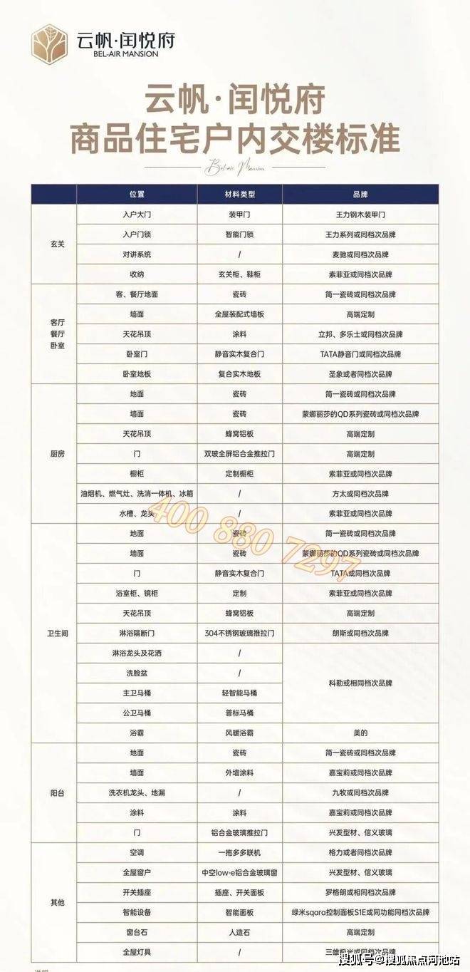 云帆·闰悦府精装用材上采用行业内一线品牌按照改善型住宅的标准来打造,入户门采用王力钢木装甲门,配备智能门锁系统,室内全屋墙面采用高端定制装配式墙板,地面客餐厅为简一品牌瓷砖,全屋配以TATA静音实木复合门,厨房方面,厨房四件套(油烟机、燃气灶、洗碗机、冰箱)配置方太品牌,全套厨房系统直接可用,省心省力,卫生间配置尤为考究,标配科勒品牌花洒与五金配件,全屋科勒配备马桶,主卫配备轻智能马桶,公卫为普标陶瓷马桶,且全屋搭配格力中央空调多联机系统,整体风格现代高端。