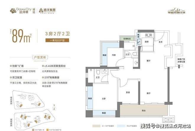 89㎡的3房2厅2卫,设计的是经典竖厅格局,客厅3.154米开间,客餐厅约18.8㎡,LDKB一体化,S墙设计预留冰箱卡槽位,动静分区,分别做到了主卧13.66㎡/次卧7.04㎡/次卧6.28㎡(实测面积,去掉墙体),主卧+1个次卧270°飘窗设计,U型厨房,公卫三段式分离,客厅连接卧室出7.56平的大阳台,得房率约76.2%(不含赠送),东南、西南或西北朝向。