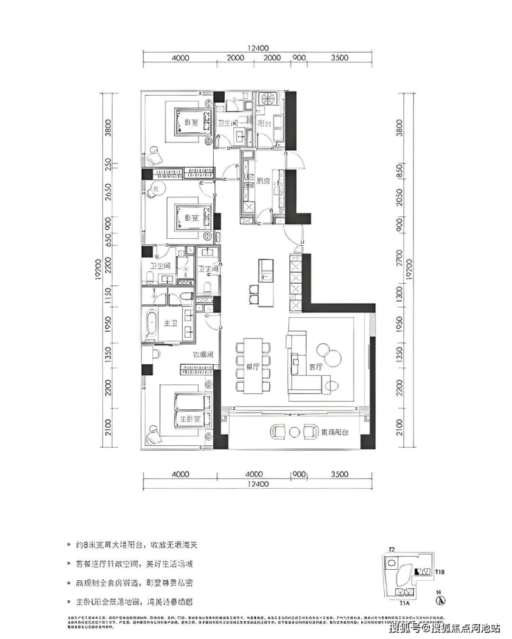★280㎡三房两厅四卫:位于1栋三、四单元24-32层,为05、08户型。拥有超8米超宽幕开间,厅出阳台可直面海景。采用三套房设计,主卧配备L形全景落地窗,占据270°最佳观海位。