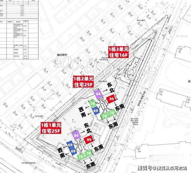 从楼栋的分布看,1栋2单元84平主卧到隔圳新村的间距是16.2米,1栋3单元有37米,3单元到金地上塘道二期是28.9米,1单元的78平离金地上塘道二期也有33米,这个距离还包含了佳民路本身的路宽,所以都算是“握手楼”的范畴,站在马路上就能看见里面的阳台和窗户。