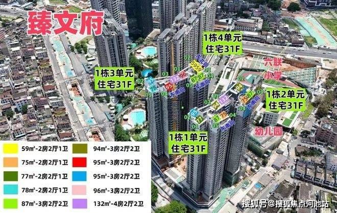 臻文府,由坪山本地房企六和集团打造,也是六和城二期,总占地面积约0.92万㎡,总建筑面积约6.85万㎡,计容建筑面积约5.32万㎡,容积率5.76,绿化率25%,共由4栋总高31层住宅组成,分别是1栋/1/2/3/4单元,另外配建1所9班制幼儿园。总规划520户,1栋1/4单元是2梯5户,1栋2/3单元是2梯4户,地下2层,停车位358个,停车位占比约1:0.69。