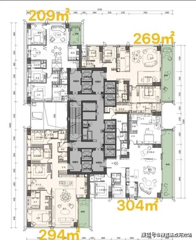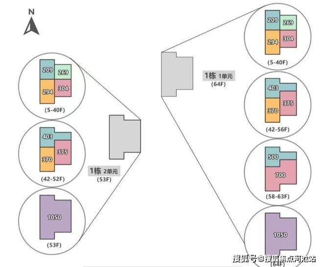 【户型面积】低区209-294-269-304㎡,高区370-375-403㎡,超高区500平-700平-1050㎡