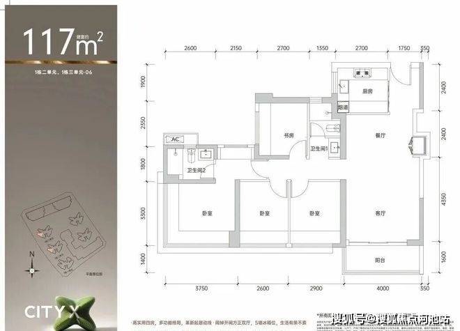 117㎡的4房2厅2卫,1栋2/3单元06户型,设计的是经典竖厅格局,进门入户玄关,客厅4米开间,LDKB一体化,S墙设计预留冰箱卡槽位,四开间朝南,动静分区,4个卧室分别做到了主卧16.5㎡/次卧9.57㎡/次卧8.58㎡/次卧7.97㎡(包含墙体飘窗),U型厨房,公卫三段式分离,得房率约90%(包含赠送),东南或西南朝向。