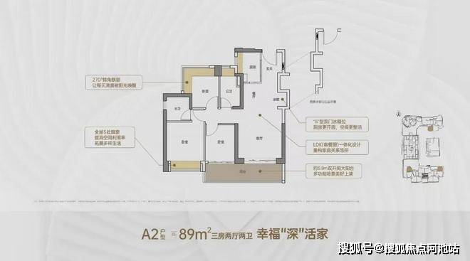 89㎡3房2卫,A2户型,传统竖厅,客厅开间3.5米,5.9米长大阳台,次卧双面转角采光,阳台朝向:西向、东向、南向。