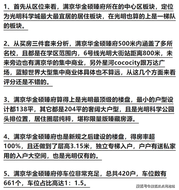 满京华金硕臻府,作为光明顶豪楼盘,金硕臻府做到了一梯一户,专梯入户的奢阔大空间,3.15米层高,是目前光明中心区板块仅有的纯大户型豪宅楼盘,居住圈层纯粹,也是光明科学公园头排为数不多在售的新盘。