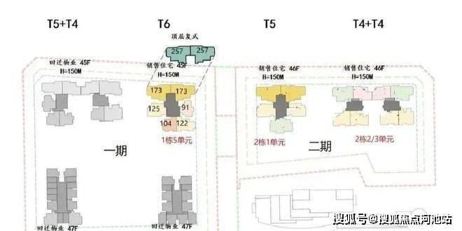 首推一期1栋5单元(45层),91-173㎡3-4房,共232套,以122-175平米4房为主,占比83%,还有两套257平顶复产品。173/257平大户型双电梯独立电梯厅入户,南区91-125平户型3梯4户。