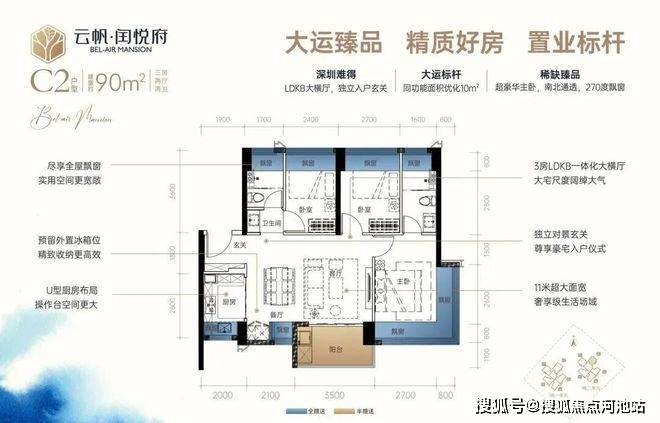 90㎡3房2厅2卫:设计的是经典横厅格局,LDKB一体化,进门入户玄关,客厅带3.5米阳台,U型厨房,主卧南北通透270度景观,卫生间干湿分离。
