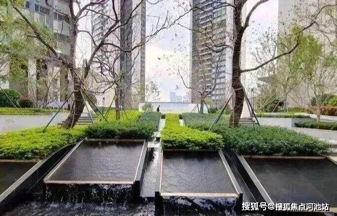 “近看落花至,远闻流水香”。听水入境,迈入第一重归家礼遇——“林下台地”生态迎宾水景,规则、细腻的线式跌水将视线高度抬高,淙淙的流水之音主动打破建筑的单调,赋予景观独特而灵动的美感。
