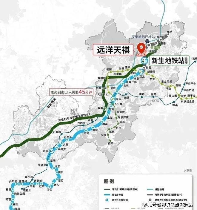远洋天祺由央企远洋集团开发,位于深圳龙岗坪地新生片区,总建筑面积约9.7万㎡,容积率5.74,绿化率40%,规划3栋46-47层超高层住宅,含768户精装交付房源,预计2025年12月交房。