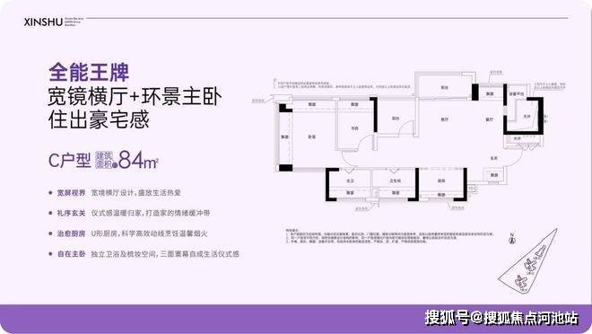 约84㎡,全能2+1房2卫户型,宽景横厅全屋通透格局,三向全尺采光,全明主卧,独立卫浴及梳妆空间,可根据需求改变功能间配比。