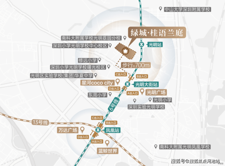 交通配套:轨道交通方面,距离地铁6号线光明大街站仅约400米,步行10分钟可达C出口;待13号线二期(北延)开通后,可直达南山科技园(20分钟)、福田核心区(1小时)。13号线二期北延段设11座车站,最高时速100km/h。