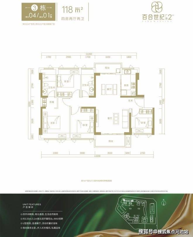 3栋1单元04/3栋2单元01户型,设计的是竖厅南北通透格局,进门入户玄关,客厅4.15米开间,客餐厅分离设计,南北双阳台,阳台主朝西南或东南向。