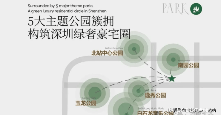 南园公园、北站中心公园、逸秀公园、白石龙音乐公园、玉龙公园环绕;