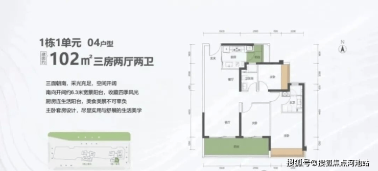 99㎡的3房2厅2卫,1栋1单元02户型,设计的是竖厅格局,客厅3.5米开间,LDKB一体化设计,进深11.7米,动静分区,三卧室朝东北向看科学公园,3个卧室分别做到了主卧18.06㎡/次卧9.57㎡/次卧7.59㎡(包含飘窗),二字型厨房还带1个生活阳台,公卫三段式分离,得房率约:80%(不含赠送),阳台6.55㎡东南朝向。套内面积79.2㎡+赠送面积12.58㎡=实用面积91.78㎡,加上赠送后得房率约92.7%。