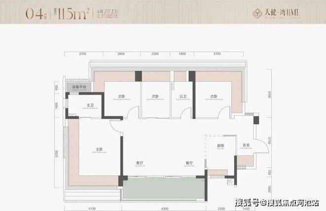 115㎡4房2卫,横厅户型,朝南看海,入户独立玄关,但三个次卧朝北;