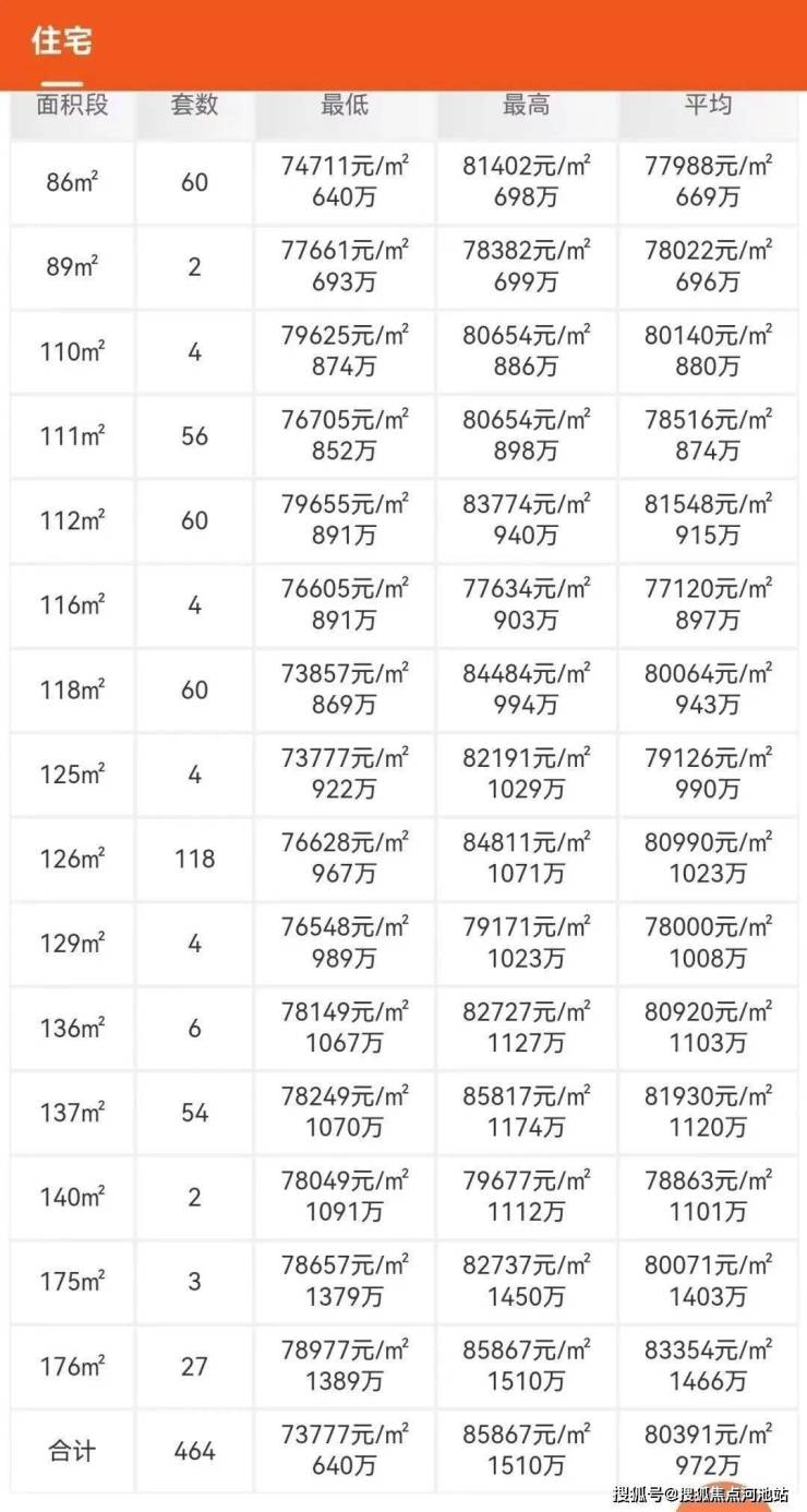 龙岸君粼本批产品共备案464套住宅,户型建面约为86-176㎡,单价约7.37-8.58万/㎡,均价约8万/㎡。
