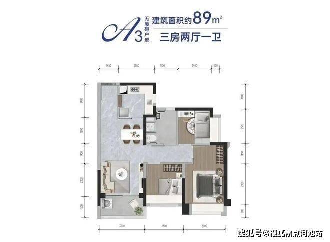 建筑面积:约89㎡,户型设计:三房两厅一卫
