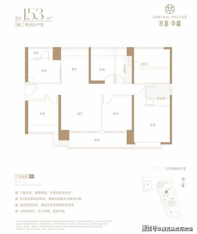 153㎡的5房2厅2卫,设计的是竖厅南北通透格局,四开间朝南,全屋飘窗,客厅连接次卧出6米长大阳台,U型厨房,还带1个小生活阳台,卫生间干湿分离,得房率约73%(不含赠送),阳台主朝东南向。
