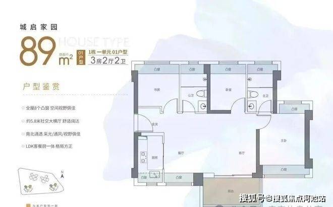 1单元06户型89㎡三房两卫,总价228-270万