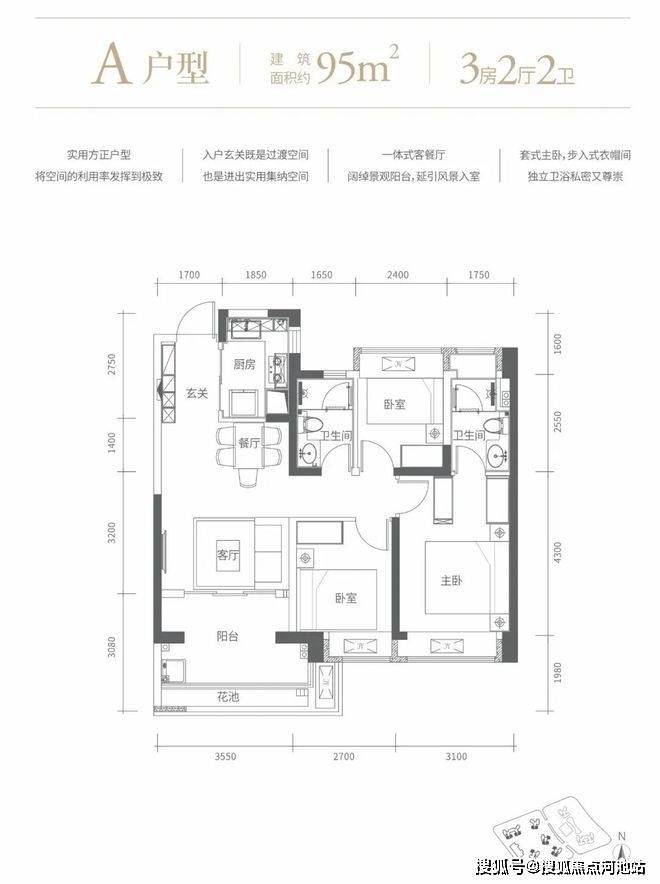 95㎡的3房2厅2卫,设计的是经典竖厅格局,客厅3.55米开间,进门玄关,LDKB一体化设计,动静分区,三开间朝南,3个卧室分别做到了主卧15.19㎡/次卧8.64㎡/次卧7.56㎡(包含墙体飘窗),L型厨房,卫生间干湿分离,得房率72.48%(不含赠送),有东南、西南或正南朝向。