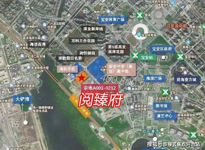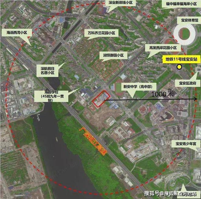 该地块位于宝中西侧,是宝中最后一个发展板块,具体位置在金科路与罗田路交汇处西南侧,北面是海韵学校、深航福利房深航假日名居,西面就是大铲湾,南面是湾区产业投资大厦,东面为新安中学(集团)高中部。