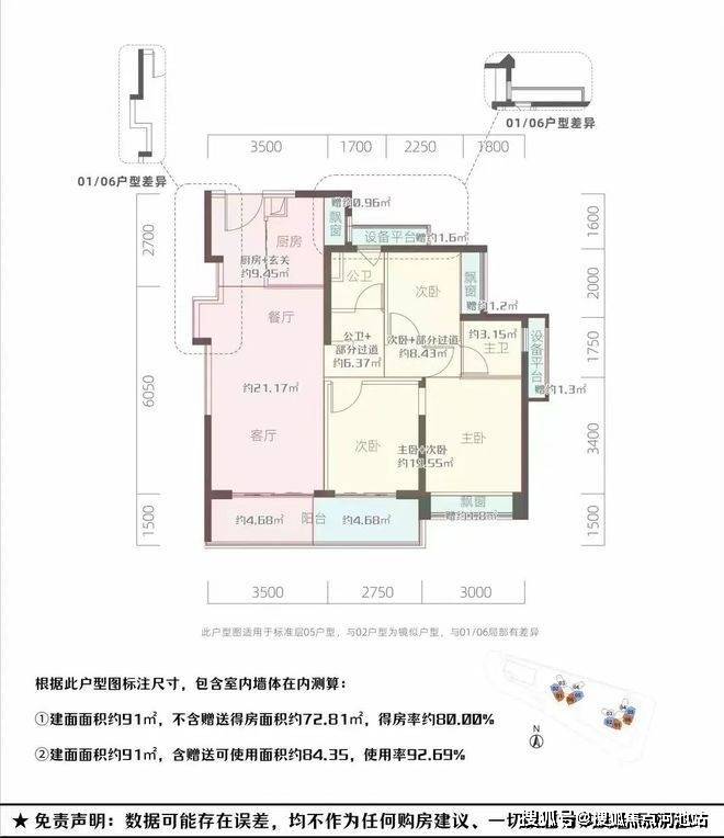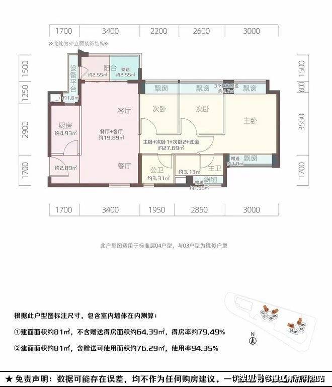81㎡的3房2厅2卫,设计的是竖厅南北通透格局,客厅3.4米开间,3个卧室分别是3米/2.6米/2.2米的宽度,L型厨房,得房率:94.35%(包含赠送),阳台西北或东北朝向。