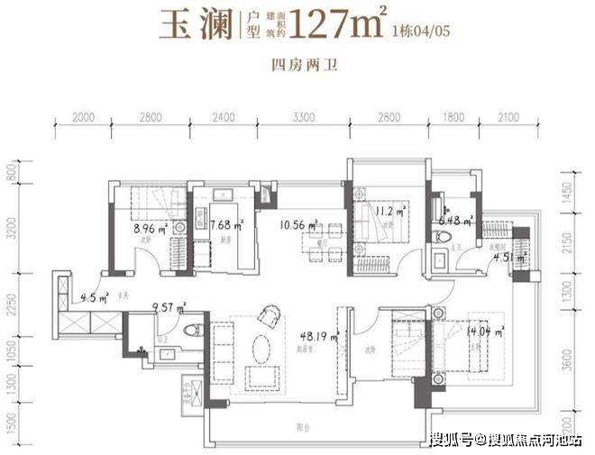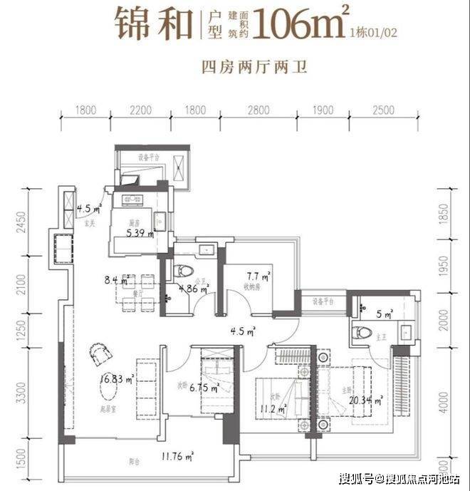 106㎡的4房2厅2卫,设计的是竖厅格局,客厅3.7米开间,LDKB一体化,S墙设计预留冰箱卡槽位,四开间朝南,动静分区,主卧270°无柱转角飘窗还带1个设备平台约1.52平,分别做到了主卧20.34㎡/次卧11.2㎡/次卧7.7㎡/次卧6.75㎡(包含墙体飘窗),U型厨房烟道外置,卫生间干湿分离,得房率约101.16%(包含赠送),客厅连接次卧出大阳台11.76平,东南朝向。