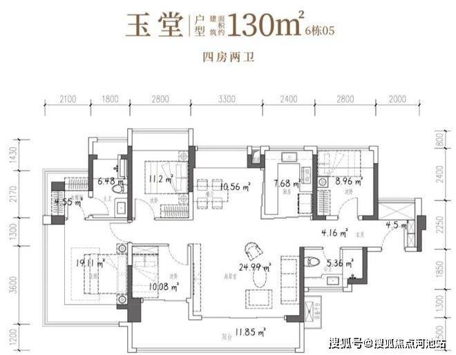 130㎡的4房2厅2卫,设计的是竖厅南北通透格局,进门独立玄关,客厅5.1米开间,客餐厅分离化设计,主卧270°无柱转角飘窗+衣帽间,分别做到了主卧23.66㎡/次卧11.2㎡/次卧8.96㎡/次卧7.84㎡(包含墙体飘窗),U型厨房烟道外置,卫生间干湿分离,得房率约101.95%(包含赠送),客厅连接次卧出超大阳台约14.09平,东北朝向。