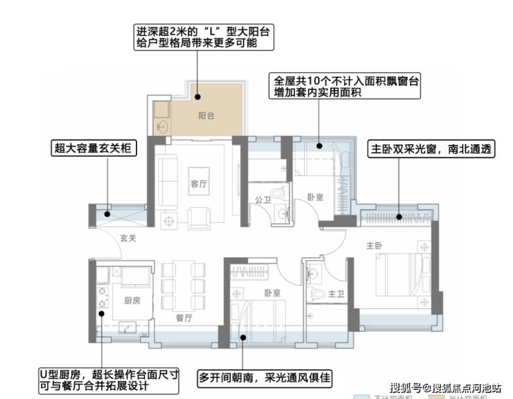 ●配备局部进深达2.1米、约6.2㎡的L型大阳台;