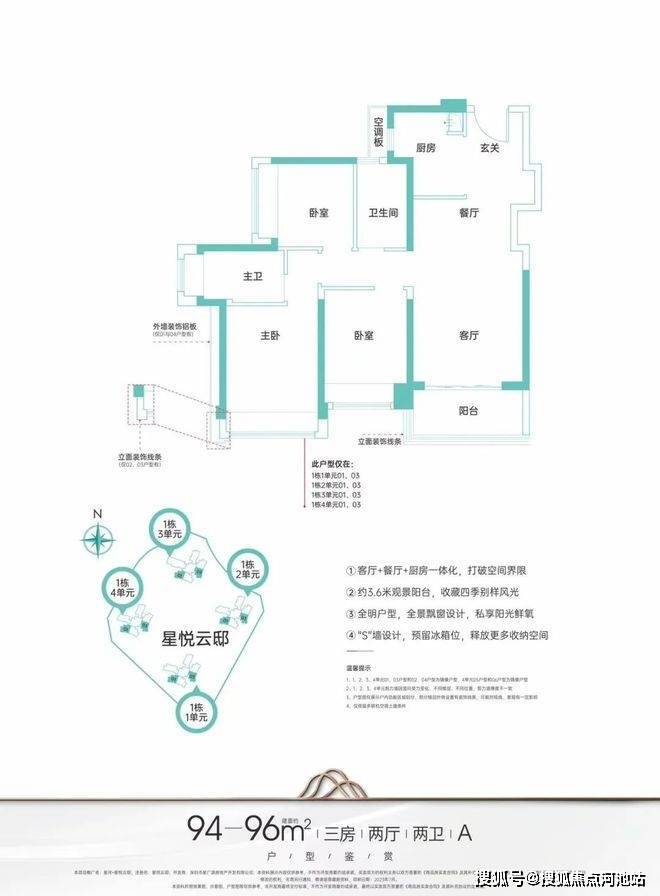 94㎡的3房2厅2卫,设计的经典竖厅格局,客厅3.6米开间,客餐厨一体化,S墙设计预留冰箱位,三开间朝南,U型厨房,得房率:78.15%(不含赠送),有西南及东南朝向。