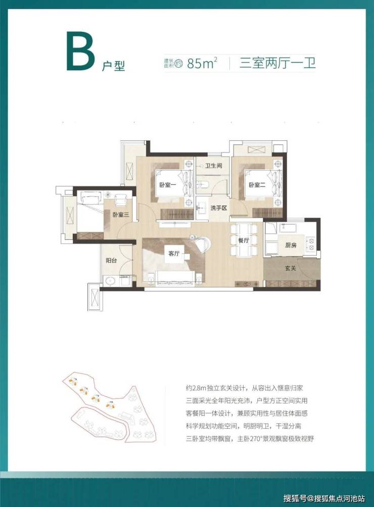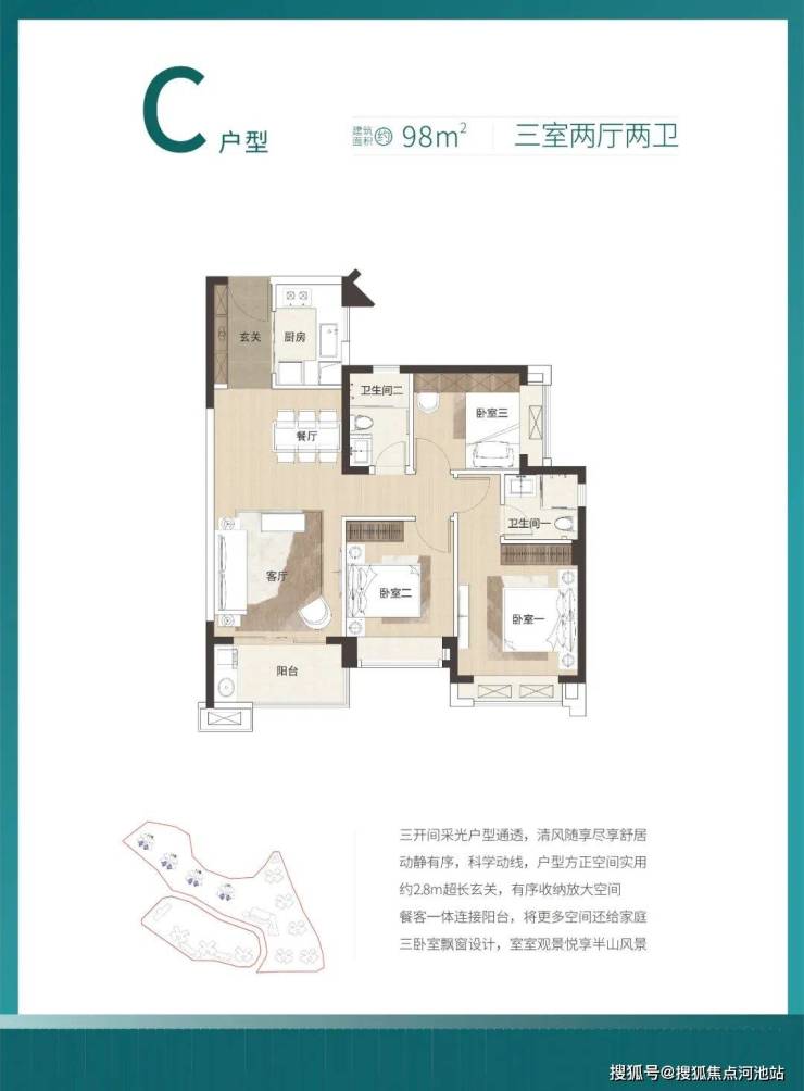 推售产品:85-98-100㎡3房(使用率约80%)