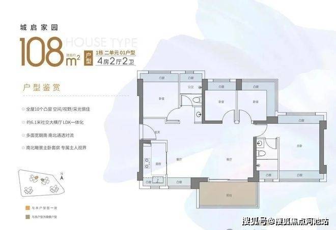108㎡的4房2厅2卫:横厅南北通透格局,进门独立玄关,客餐厅6.1米开间,LDKB一体化,五开间朝南,主卧双飘窗通透设计,全屋10个凸窗,L型厨房,卫生间干湿分离,得房率约90%(包含赠送),阳台主朝西南或东南向。