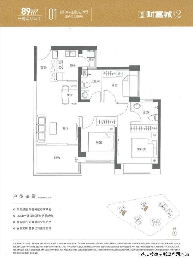 89㎡的3房2厅2卫,设计的是经典竖厅格局,客厅3.29米开间,3个卧室分别是3.3/2.8/2.5米的宽度,L型厨房,带1个小生活阳台,得房率约:76%(不含赠送),西南、东南及东北朝向。
