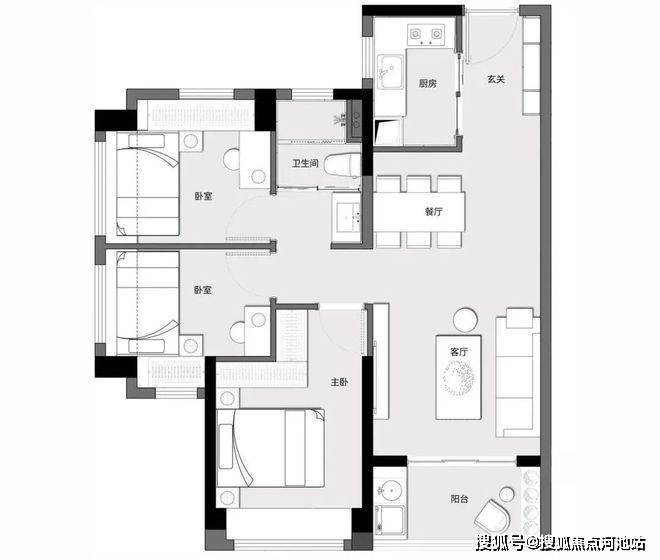 C1户型|建面约89㎡三房两厅两卫户型方正通透,全南向布局;客餐厅一体化;卧室全飘窗,雅致通透;贴心工卫设计、干湿分离。