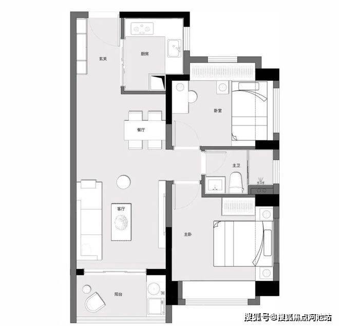 建面约70㎡两房两厅一卫户型方正通透,全南向布局;U型厨房设计,合理分区;客餐厅一体化;卧室全飘窗,雅致通透。
