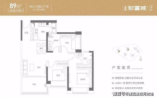 89㎡的3房2厅2卫,设计的是经典竖厅格局,客厅3.4米开间,3个卧室分别是3.3/2.8/2.5米的宽度,L型厨房,带1个小生活阳台,得房率:86.13%(包含赠送),西南、东南及东北朝向。