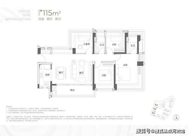 约115㎡的4房2卫,东南或西南朝向以及西北朝向,有3种户型格局,但整体差异并不大,都是横厅设计,阳台也都非常宽敞。主要核心区别是阳台的设计,这应该是为了贴合楼栋朝向、景观所做的调整。