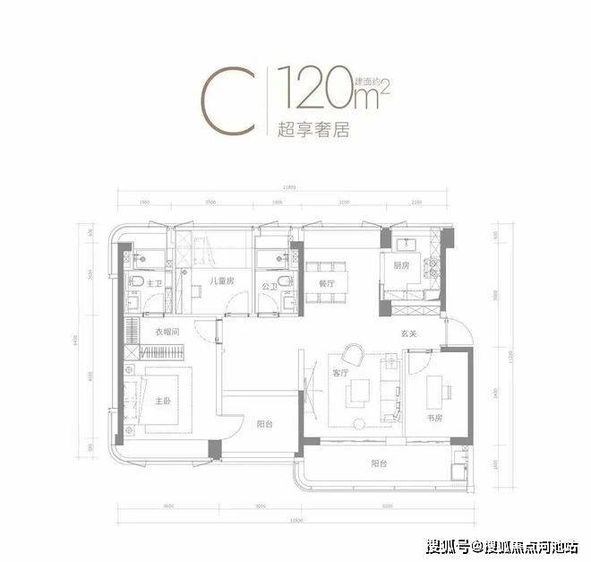 120㎡的4房2厅2卫,设计的横厅南北通透格局,进门入户玄关,四开间朝南,3个卧室分别是3.6米/3米/2.9米的宽度,另一个卧室不知道尺寸,客厅连接卧室出6.2米大阳台,U型厨房,得房率:75.91%(不含赠送),阳台主朝西南或东南向。