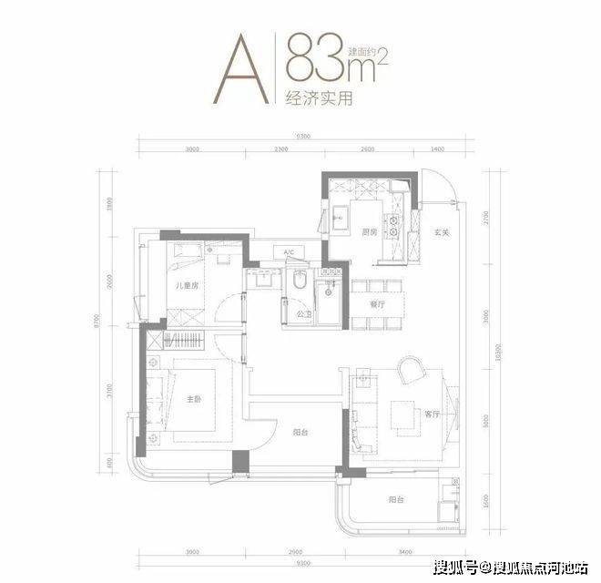 83㎡的3房2厅1卫,设计的是竖厅格局,客厅3.4米开间,客餐厅一体化,三开间朝阳,3个卧室分别是3米/2.9米/2.6米的宽度,U型厨房,卫生间三段式分离设计,得房率:75.64%(不含赠送),有朝南向或东北向。