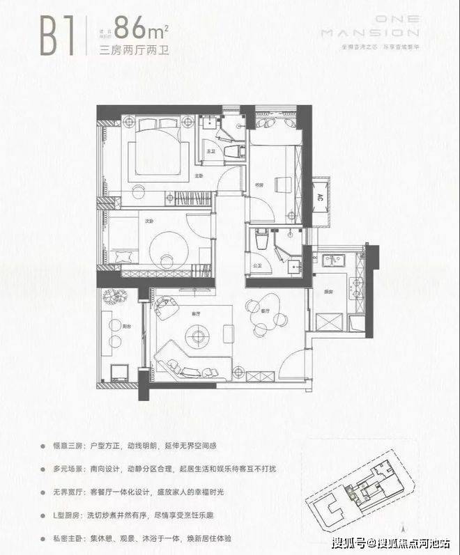 建面约86㎡这个户型方正通透,动线明朗,进门后客餐厨阳基本连成一线,大大拉伸了空间感,把约86㎡房子的客厅使用面积做到了约19㎡,至少匹敌市面上一般约100-120㎡户型的客厅空间。高楼层大主卧,还能一览阳台山美景,集休憩、观景、沐浴于一体,私密性极好