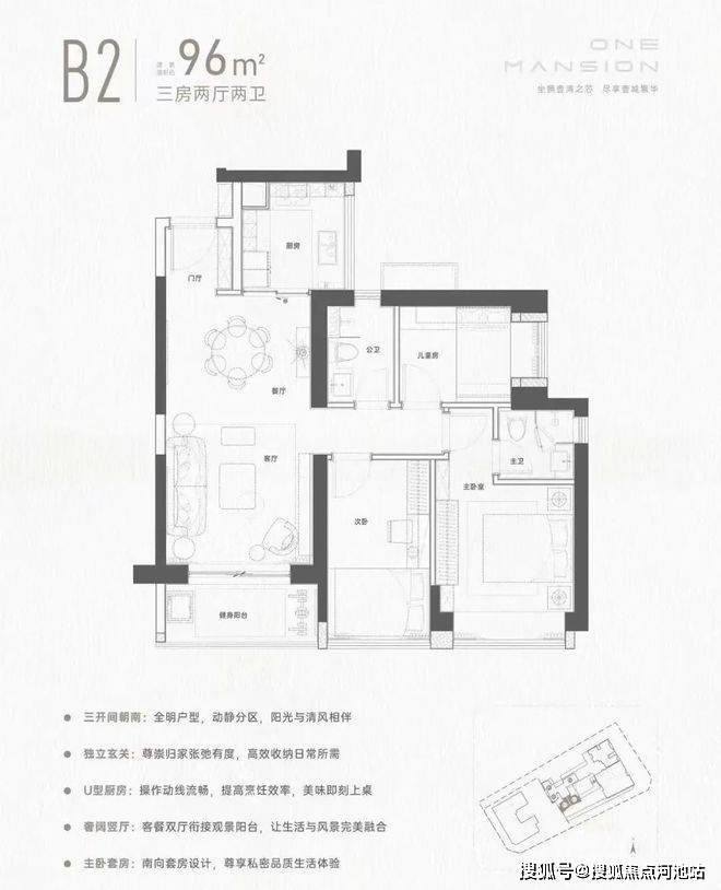 建面约96㎡的3房2厅2卫,三开间朝南,采光通风极佳。客厅实际使用面积做到了约22㎡,奢阔客餐竖厅衔接观景阳台,空间尺度更大。健身阳台的设计,更符合未来人居健康需求,平时练练瑜伽,做做体能,喝茶、品酒,与阳光、清风相伴,尽享惬意生活。