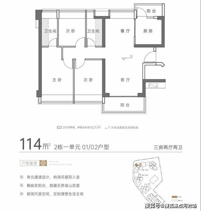 114㎡三房两厅二卫:该户型同样是南北通透双阳台设计,是可售房源的主力户型,分布广泛有6条腿。朝向有东南、西南、东偏南、南偏西四种,周边建筑物暂时都不算高,只要不是低于9F视野都还凑合。