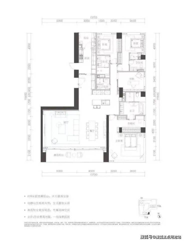T1B栋D与T1A栋F户型格局相似,但是终于把“中央公卫”去掉了,换成吧台,明显协调了许多。东端头无遮挡,270°景观,适合看日出。