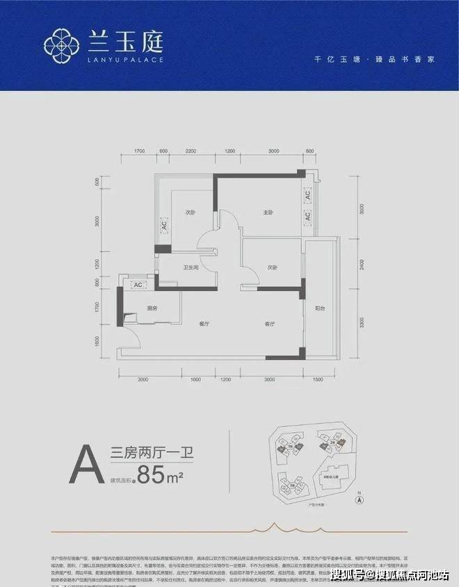 85㎡的3房2厅1卫,A户型,设计的是竖厅格局,客厅开间3.3米,LDKB一体化,三开间朝南,3个卧室分别做到了3米/2.8米/2.4米的宽度,客厅连接次卧出5.7米长的大阳台,L型厨房,得房率约79%(不含赠送),西南或东南朝向。