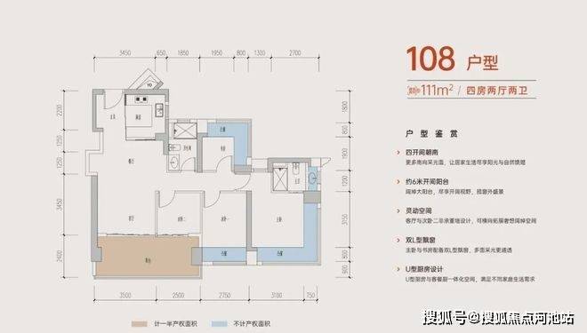 108-110㎡的4房2厅2卫,A户型,设计的是经典竖厅格局,进门入户玄关,客厅3.45米开间,LDKB一体化,S墙设计预留冰箱卡槽位,四开间朝南,动静分区,主卧+1个次卧270度大飘窗,客厅连接次卧出6米长大阳台,分别做到了主卧16.4㎡/次卧11.2㎡/次卧7.84㎡/次卧6.25㎡(包含墙体飘窗),U型厨房,卫生间干湿分离,得房率约:77.3-77.39%(不含赠送),西南朝向。赠送面积18.4㎡,加上赠送得房率94.04%。