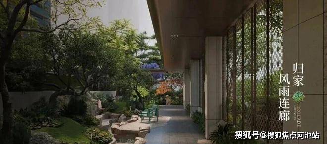 风雨连廊的链接,如一条串联绿城生活的珍珠项链,在“流光溢彩”的氛围中,将绿植水景、休憩平台一一相连,塑造移步异景的立体生态廊道。