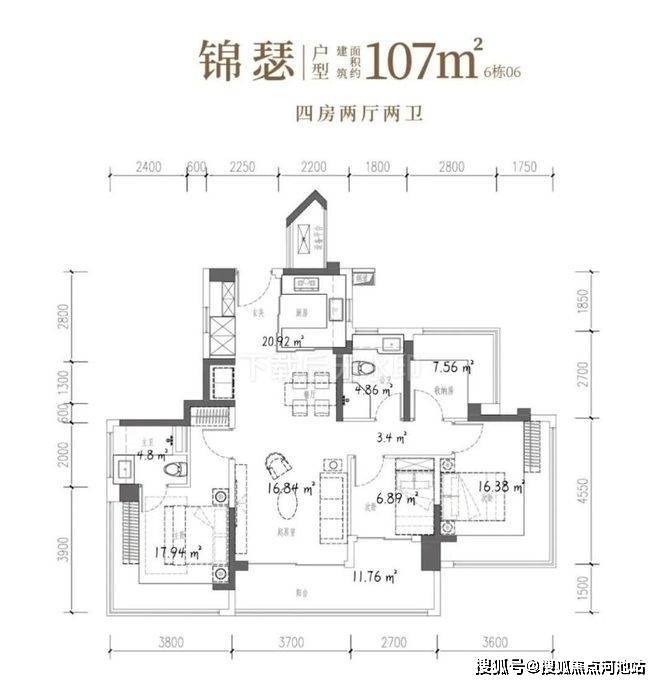 107㎡的4房2厅2卫,设计的是竖厅双龙抱珠格局,客厅3.7米开间,LDKB一体化设计,预留冰箱卡槽位,四开间朝南,主卧+2个次卧270°无柱转角飘窗,分别做到了主卧17.94㎡/次卧16.38㎡/次卧7.56㎡/次卧6.89㎡(包含墙体飘窗),U型厨房烟道外置,卫生间干湿分离,得房率约104.06%(包含赠送),客厅连接次卧出超大阳台约11.76平,东北朝向。