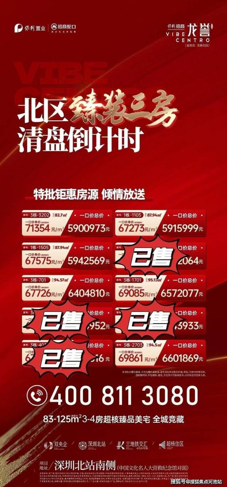 保利招商·龙誉地址位于深圳市龙华区民塘路与民丰路交汇口;距离深圳已通车的地铁4/5/6号线深圳北站约500米左右。保利招商龙誉83/95/125平折扣单价6.1万起带装修,预约看房价格可以更优惠,最终房价包您满意!龙华保利招商龙誉开发商售楼处电话:400-811-3080,中介请勿扰,过来参观样板间记得提前预约,感谢您对我们工作的支持与配合。