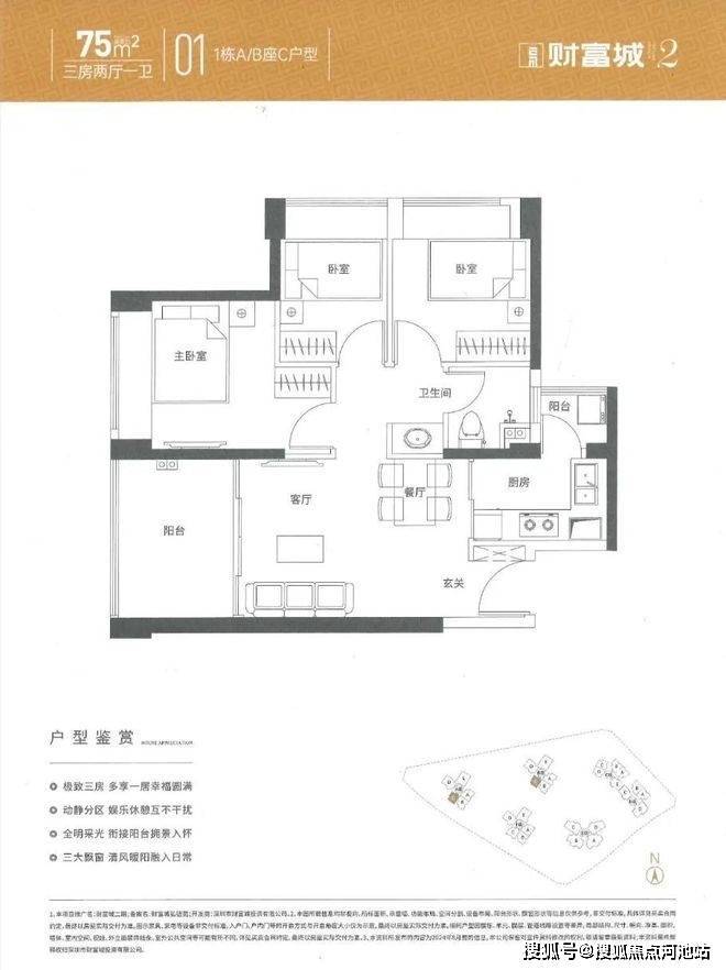 75㎡的3房2厅1卫,设计的是竖厅格局,客厅3.05米开间,3个卧室分别是3.1/2.85/2.25米的宽度,L型厨房,带1个小生活阳台,卫生间三段式分离设计,得房率约:76%(不含赠送),西南及西北朝向。