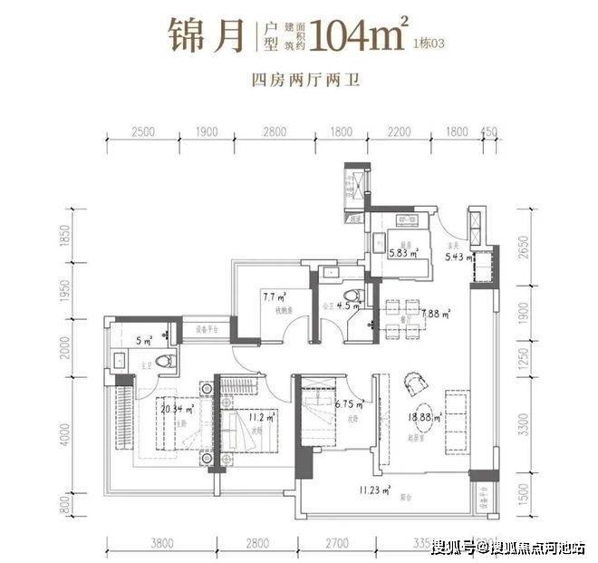 104㎡的4房2厅2卫,设计的是竖厅格局,客厅4.15米开间,LDKB一体化设计,预留冰箱卡槽位,四开间朝南,动静分区,主卧270°无柱转角飘窗还带1个设备平台约1.52平,分别做到了主卧20.34㎡/次卧11.2㎡/次卧7.7㎡/次卧6.75㎡(包含墙体飘窗),U型厨房烟道外置,卫生间干湿分离,得房率约100.71%(包含赠送),客厅连接次卧出大阳台约11.23平,西南朝向。